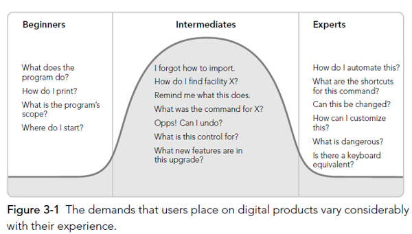 Em um gráfico Cooper traz a divisão dos três níveis como podemos ver abaixo. A maioria das pessoas iniciantes que encontram-se no começo da curva, logo migrarão para o intermediário ou irão procurar outra tarefa em que possam fugir do rótulo de iniciantes. Raramente os usuários terão (ou dedicarão) tempo suficiente para tornarem-se avançados, por isso maior parte de nossos usuário sempre serão intermediários.