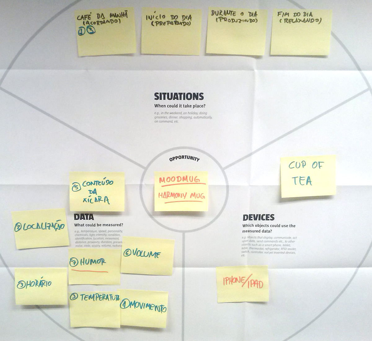 Em seguida focamos em uma oportunidade específica e passamos a desdobrá-la em um framework de brainstorm. No fim dessa etapa saímos com uma proposta conceitual a partir da integração entre dados, situações e dispositivos relacionados à oportunidade escolhida. Esse mix por fim resultava em uma proposta de conceito inovador/inteligente para o solução do problema inicial.